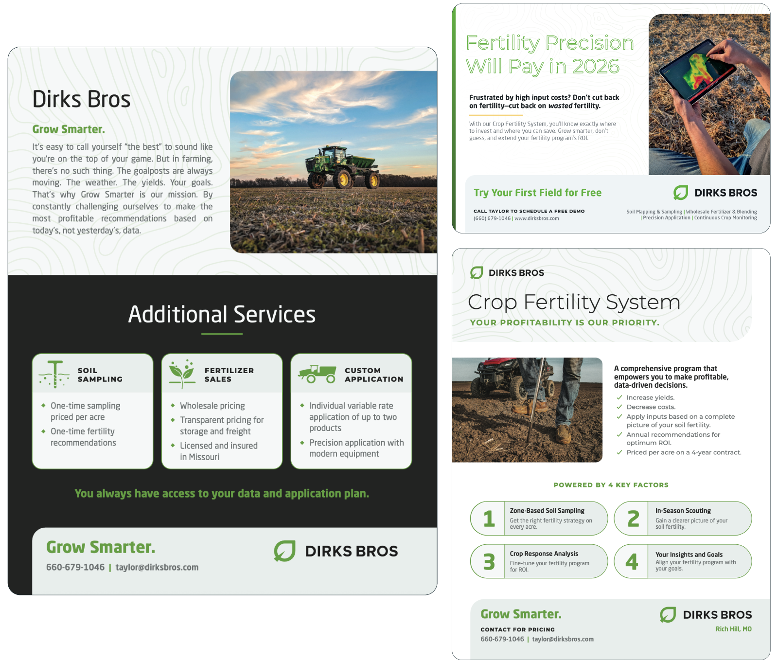 "Grow Smarter Every Season" are the first words farmers encounter on Dirks Bros' website, which ties together all of the company's services under this one tagline. Each page explores how the company's services will improve a farm's bottom line.