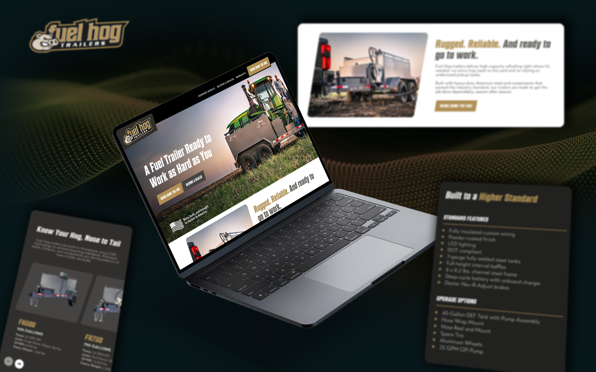 As a startup brand, Fuel Hog invested in a one-page website that would help potential customers get acquainted with its hogs. As Fuel Hog trailers thrive in the real-life conditions of the field, Fuel Hog's website thrives in the real-life conditions of the Internet, presenting the company's trailers with clear messaging, striking photography, and solid functionality.